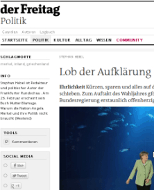 *) Stephan Hebel ist Redakteur und politischer Autor der Frankfurter Rundschau . Am 26. Februar erscheint sein Buch Mutter Blamage. Warum die Nation Angela Merkel und ihre Politik nicht braucht (Westend). [Quelle: freitag.de]