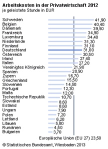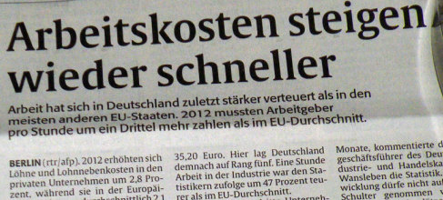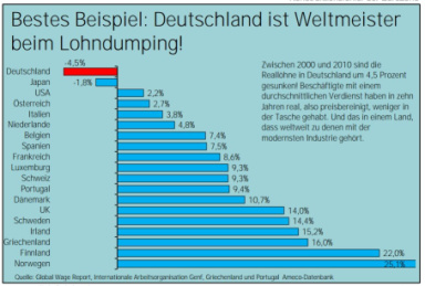 ![]() 27.03.2013 13:35 Irreführung von Amts wegen - sind die Lohnkosten wirklich zu hoch? Noch ist die Schockstarre in Sachen Zypernkrise nicht überwunden, da läuft schon die nächste neoliberale Angriffswelle auf Sozialstaatlichkeit. Befördert durch die aktuelle Veröffentlichung von Daten durch das Statistische Bundesamt in Wiesbaden, die eine Steigerung der Arbeitskosten von 2,8% ausweisen und damit den EU-Durchschnitt um 0,7% übertreffen. Obwohl die Bundesrepublik gleichwohl vom 7. auf den 8. Platz im Arbeitskostenranking gefallen ist, wird die Angst vor schwindender Wettbewerbsfähigkeit geschürt. JWD ![]() Was ist daran Irreführend? Die Arbeitskosten alleine sind für die Wettbewerbsfähigkeit letztlich sehr begrenzt maßgebend. Wie jeder weiß ist es die Produktivität und mithin Lohnstückkosten, die den Ausschlag auf der Lohnseite geben. Wäre dem nicht so, müsste ja Bulgarien mit Arbeitskosten von 3,70 Euro und nicht Deutschland Exportweltmeister sein. Aber in Bulgarien liegt die Wirtschaft am Boden. Dies gilt übrigens auch für die meisten anderen Länder mit Niedrigstlöhnen. Wenn jemand von sinkender Wettbewerbsfähigkeit wegen steigender Löhne spricht und in diesem Zusammenhang nicht Produktivität und Lohnstückkosten erwähnt, dann will er in die Irre führen! ![]() Um jetzt den ganz gewieften neoliberalen Hardlinern den Wind aus den Segeln zu nehmen noch folgendes: ![]() Quelle: sphotos-f.ak.fbcdn.net Deutschland hat sich durch Lohndumping massiv Wettbewerbsvorteile verschafft Sind also doch die Lohnkosten entscheidend? Nichtdoch. - Selbstverständlich wurde gleichzeitig nach allen Regeln der Kunst rationalisiert wo es nur geht und so die Arbeitsproduktivität erhöht. Das haben natürlich auch andere gemacht. Sonst könnte bspw. Norwegen mit den höchsten Löhnen, seinen Bürgern nicht auch den höchsten Wohlstand bieten. Dort ist technologischer Fortschritt mit einer Lohnsteigerungsrate von jährlich 2,5% den Bürgern zugute gekommen. Von Arbeitssklaven mit HarzIV, die wie bei uns nur den Reichtum einer steuergedumpten Elite speisen, habe ich von dort noch nichts erfahren. Es drängt sich auch die Frage auf, warum die dominanten Überschussländer (Hochlohnländer) überhaupt die Niedriglohnländer in die Währungsunion aufgenommen haben und gleichzeitig das einzige Regulativ, nämlich die für alle vorgegebene Inflationsrate unwirksam machen, indem einfach definiert wird, es ginge um eine durchschnittliche Marsche die auf alle Mitglieder bezogen sei. Wettbewerbsverzerrung, auch ständige, durch Unterschreiten der Ziel-Inflationsrate von 2% ist kein Regelverstoß und wird nicht geahndet. Die Wirtschaftsgemeinschaft wird somit zu einer Freihandelszone mit eingebautem Lohn- und Steuerdumping, in der die Schwachen von den wirtschaftlich Starken aufgefressen werden. Alle maßgeblichen Institutionen (EZB, IWF, ESM u.a.) in diesem Wirtschaftsgebilde sind außerparlamentarisch in der Hand der wenigen Nutznießer dieses Systems und helfen mit, eine soziale Abwärtsspirale in Gang zu halten, um die Menschen skrupellos auszupressen. (siehe auch - Soros bestätigt: Die Krise ist gewollt - vom 31.01.2013 ..hier) Presseschau: ![]() Rheinpfalz 27.03.2013 ![]() Sonntagszeitung Rheinpfalz 24.03.2013 Die saarländische CDU-Ministerpräsidentin, so wird gemeldet, setze sich für einen Spitzensteuersatz von 53% (wie in Kohl's Zeiten) ein. Oh wie böse! Hochintelligent und kompetent kommt sie auf dem Foto auch nicht gerade rüber. Die Wirtschaft warnt: 1,4 Millionen Stellen stehen auf dem Spiel. Und " Schnipp ", im Bild wird's deutlich, gleich ist Eine/Einer weg. - Geht's noch? Wie wär's damit: Mit den zusätzlichen Steuereinnahmen können mehr Kindergartenplätze und andere dringend notwendige Dinge finanziert werden, es kommt mehr Geld in die Taschen der Verbraucher, die Konjunktur zieht an, mehr Arbeitsplätze entstehen weil die Inlandsnachfrage steigt. Deutsche Lohn- und Kaputtsparpolitik hat Auswirkungen auf Europa! Staatverschuldung und Massenarmut steigt rasant an, nur die Finanzelite stopft sich die Taschen voll. Die Kluft zwischen Arm und Reich war noch nie größer. Passend zum Thema: 27.03.2013 Na, Ihr Pseudochristen in der CDU/CSU – vergesst ja nicht, an Ostern Buße zu tun für die Menschenleben, die Ihr Eurer Austeritätsideologie opfert Was jetzt in einer Studie der Fachzeitschrift „Lancet“ berichtet wird, konnte man alles wissen: in Folge der sinnlosen weil erfolglosen Sparversuche mit der Krise wird bei der Gesundheitsversorgung gespart, Menschen verzweifeln wegen Arbeitslosigkeit und Perspektivlosigkeit, die Selbstmordrate unter Rückgriff auf Drogen steigt. SpiegelOnline berichtet unter der Überschrift „Euro-Krise kostet Menschenleben [..hier]“ über die Ergebnisse der Studie. [Quelle: nds.de/Albrecht Müller]. Link zum vollständigen Artikel bei ' nds.de ' ..hier
