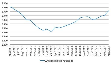 So also verkauft man die schlechteste Entwicklung in einem Monat, die seit Beginn der Verdüsterung am Arbeitsmarkt - und das ist der Beginn des Jahres 2012 - zu verzeichnen ist. Seit mehr als einem Jahr steigt - natürlich saisonbereinigt - die Zahl der Arbeitslosen fast kontinuierlich und erreicht mit einer Zunahme von 21 000 (nach der Definiton der Bundesagentur) im Mai 2013 fast wieder das Niveau, das sie vor genau zwei Jahren hatte (Schaubild). Die richtige Überschrift bei SPON hätte lauten müssen: Die Zahl der Arbeitslosen steigt rasch wieder in Richtung drei Millionen, auch die Zahl der offenen Stellen geht stetig zurück. [..]