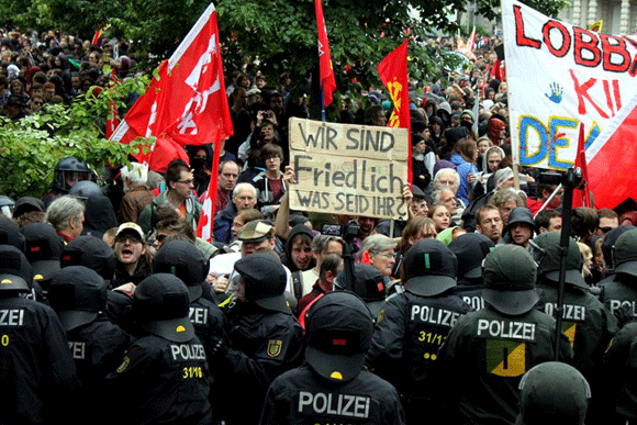 Hinter uns knapp zwanzigtausend DemonstrantInnen. Die etwa zweihundert Streitkräfte, die ohne jeden Grund und ohne jede Rechtsgrundlage mit brutaler Gewalt den Kessel von den zig Tausenden der Rest-Demonstration trennen mussten, waren von ihrer Führung wissentlich in allerhöchste Gefahr gebracht worden. Eine unbedachte Reaktion in der durch Polizeigewalt aufgeheizten Stimmung, der kleinste Ärger hätte eine Katastrophe auslösen können.