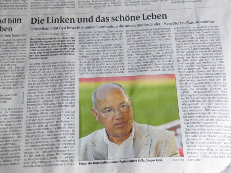 Ulrich gibt dabei mit seinem Beitrag ungewollt einen Einblick in die mentale Verfasstheit seinesgleichen. Natürlich braucht man aus der Perspektive eines Angehörigen der oberen Mittelschicht, der sich den herrschenden Eliten nahe und verpflichtet fühlt, keine Partei, die sich für die Belange der Millionen Leiharbeiter, Niedriglöhner, Minijobber, Arbeitslosen und dem Hartz IV Repressionssystem Ausgelieferten einsetzt. Eigentlich gibt es seit der Einheit in Deutschland eine strukturelle Mehrheit links der Mitte. Doch ist eine rot-rot-grüne Koalition sicher der absolute Alptraum der herrschenden Eliten. Diese gilt es mit allen publizistischen Mittel zu verhindern. Damit wird auch transparent weshalb Ulrich da sitzt, wo er sitzt." [Quelle: nds.de] Dass es sich bei Ulrichs Pamphlet, wonach eine sozial engagierte Partei wie "Die Linke**" obsolet geworden sei, um eine gezielte Medienkampagne handelt, wird auch dadurch bestätigt, dass auch andere neoliberale PR-Blätter, gleichzeitig das Thema Gysi aufgegriffen haben und ähnlichen Nonsens verbreiten. Dabei geht es um sonst nichts, als darum, ständig ein bisschen mit Dreck auf den politischen Gegner, die Sozis zu werfen. Beispiel: ![]() Rheinpfalz 08.08.2013 Link zum Schmähartikel bei ' zeit-online.de ' ..hier *) Bernd Ulrich (* 1960 in Essen) ist ein deutscher Journalist und stellvertretender Chefredakteur sowie Leiter des Politikressorts von „Die Zeit“. [..] Ulrich wurde als Sohn eines Gärtners geboren. Er schloss sein Studium der Politik mit dem Diplom ab. Danach war er Mitarbeiter beim Fraktionsvorstand der Grünen im Deutschen Bundestag. Er arbeitete seit 1991 als Journalist; zunächst schrieb er frei, unter anderem für die Frankfurter Rundschau, die taz, und die FAZ. Von 1993 bis 1996 war er Parlamentskorrespondent der Wochenpost, seit 1997 arbeitete er für den Berliner Tagesspiegel, zuletzt als Leitender Redakteur. Am 1. April 2003 wurde er Leiter des Hauptstadtbüros der Zeit und gleichzeitig stellvertretender Chefredakteur. Seit 1. August 2007 ist er Leiter des Politikressorts. Für seinen Beitrag Wer sind wir heute? über das Bild der Deutschen im Ausland erhielt Ulrich den Henri-Nannen-Preis des Jahres 2013 in der Kategorie Essay. [Quelle: Wikipedia ..hier] **) Anmerkung: Die Partei "Die Linke" ist in Wahrheit die einzige Oppositionspartei im Deutschen Bundestag, die die Bezeichnung Opposition verdient und sich deutlich von dem sonstigen neoliberalen Einheitsbrei abhebt.